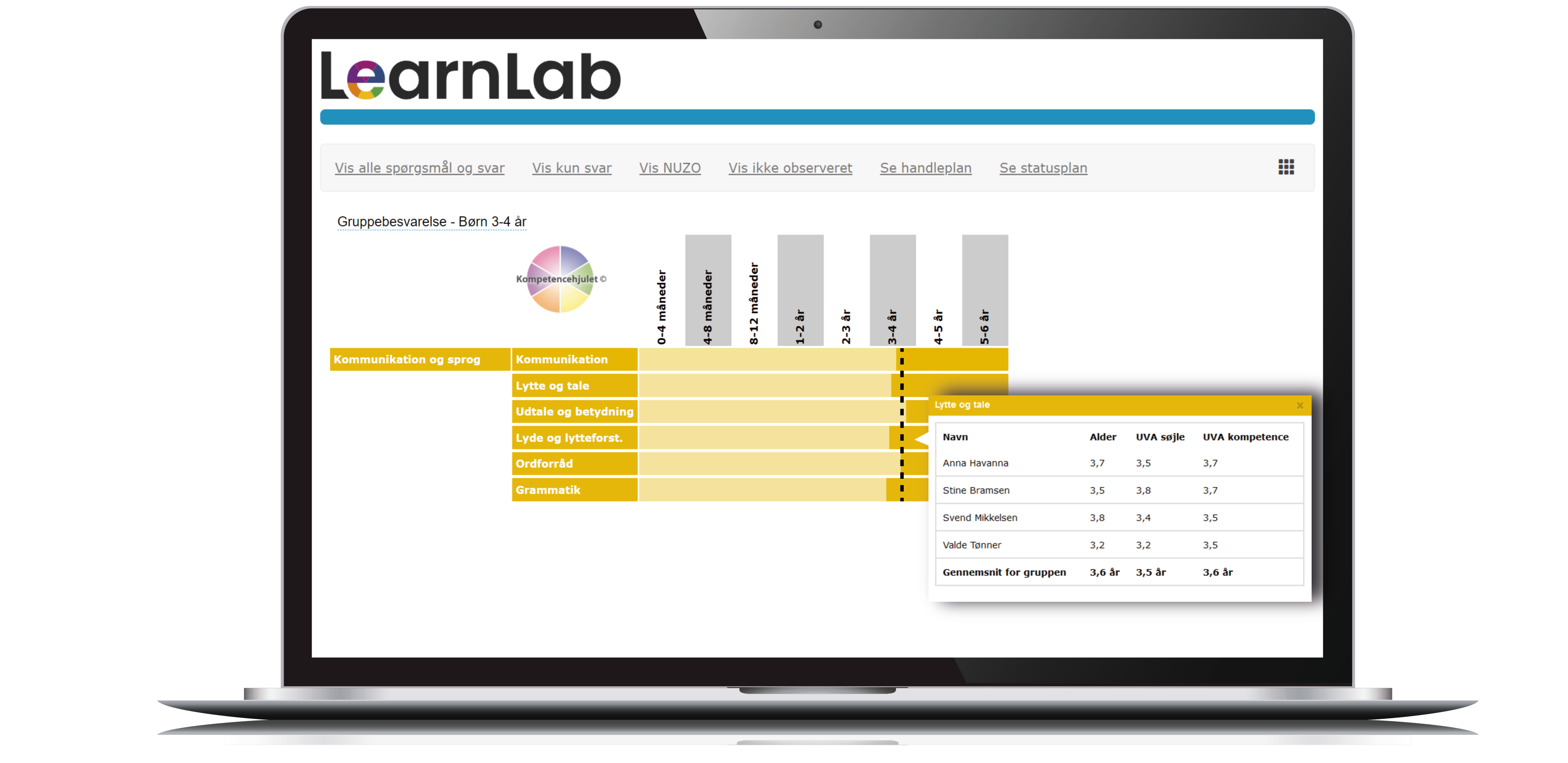 Til forskel fra 'Sprogvurdering 3-6' måler Kompetencehjulets sprogvurdering på barnets produktive sprog og receptive sprog, så I opnår en mere fyldestgørende evaluering af, hvordan barnet i det daglige bruger sproget til at kommunikere med. Kompetencehjulet giver indblik i barnets sproglige ressourcer og eventuelle vanskeligheder – og hvordan I kan støtte barnets sprog.